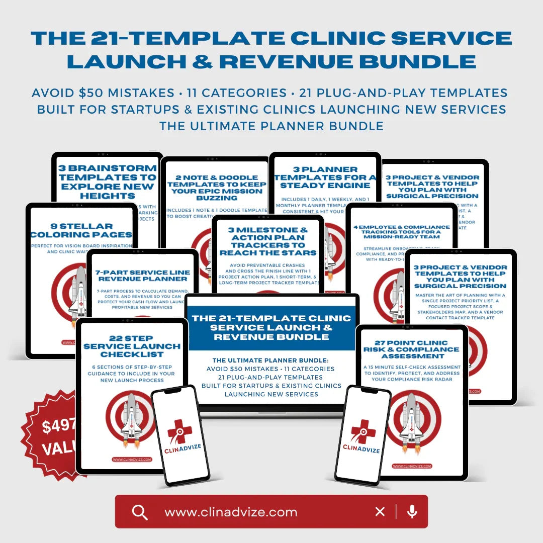 Get instant access to 21 proven templates across 11 categories that simplify your clinic service launch, compliance setup, and revenue planning. This digital kit helps you avoid $50K mistakes and hit your revenue goals faster. Includes access to The ClinAdvize Marketplace.